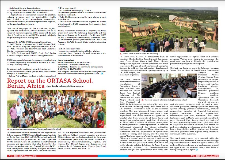 Quelques semaines après la tenue effective de l'école ORTASA au Centre d’Excellence Africain en Sciences Mathématiques et Applications (CEA-SMA), la célèbre revue IFORS en parle. Cliquez ici pour lire